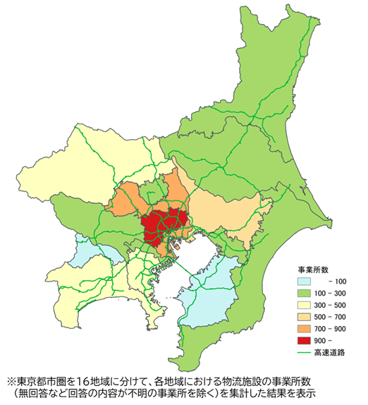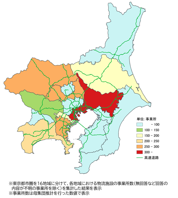 地域別の物流施設の事業所数を見ると、東京23区、埼玉県、千葉西北部で多くなっています。これらの地域では高速道路等があり輸送の利便性が高いなどの理由で立地が多いと想定されます。