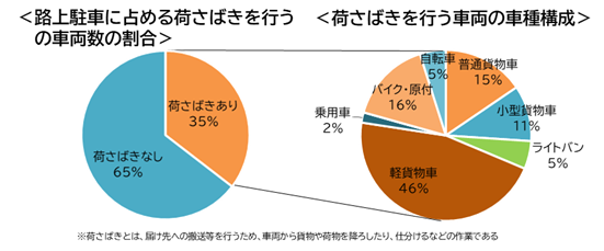 調査対象箇所における路上駐車のうち、荷さばきを行う車両の割合は、中心市街地では45%、中高層マンション周辺では35%となっています。